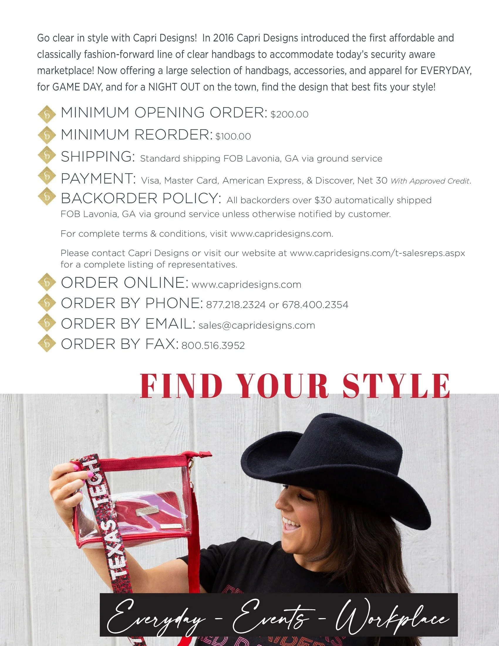 From sleek crossbodies to clear stadium bags (with flair), every piece is designed with real life in mind — effortless, elevated, and full of personality. Whether you're headed to a festival, football game, or front porch gathering, Capri’s got your season styled.